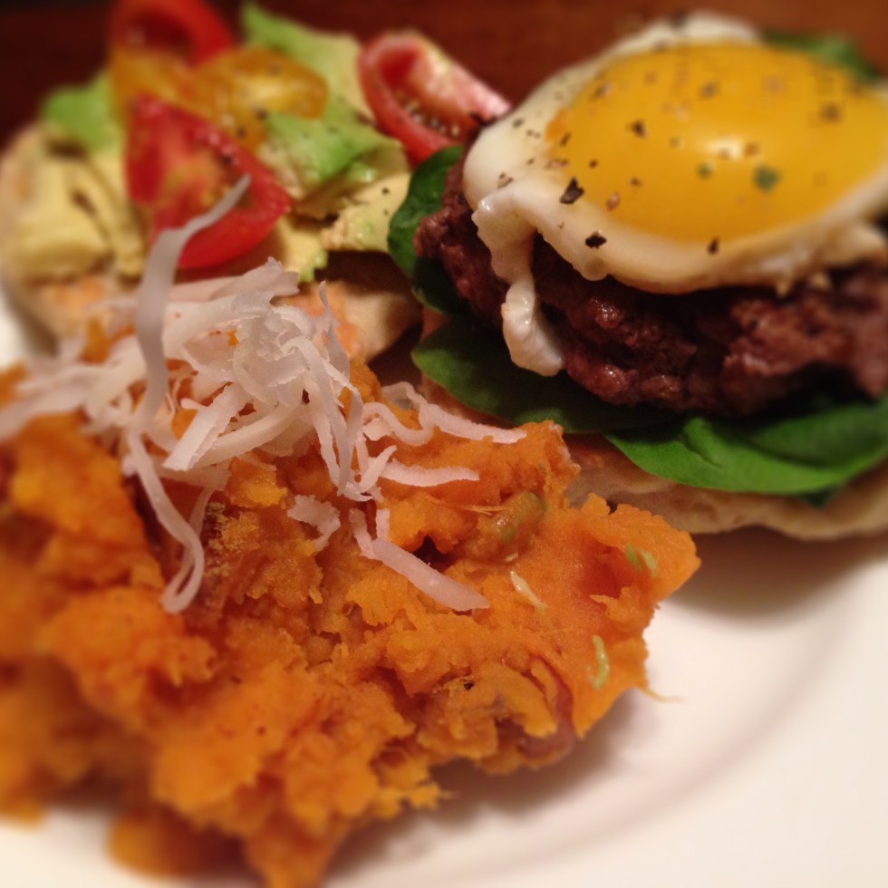 Bison Burger with Paleo GF Bun and Mashed Coconut Sweet Potato