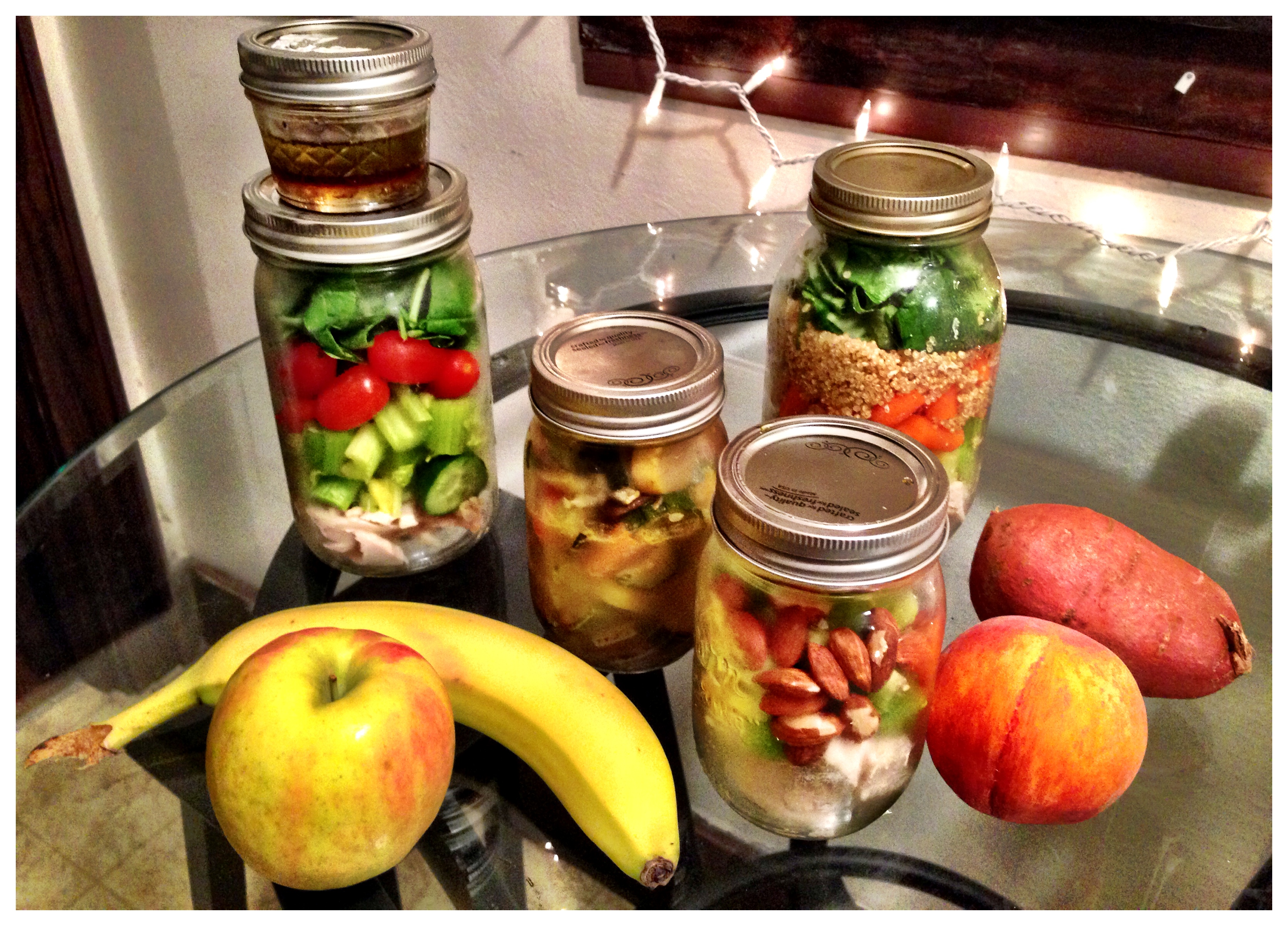As you can see above, I prepped a few of my meals for the next few days in mason jars. The jars are cheap, fun, pretty, and keep things fresh and ready to go! You can find mason jars at Michaels, Kroger, Walgreens sometimes – they are readily available down south. Yeehaw.
