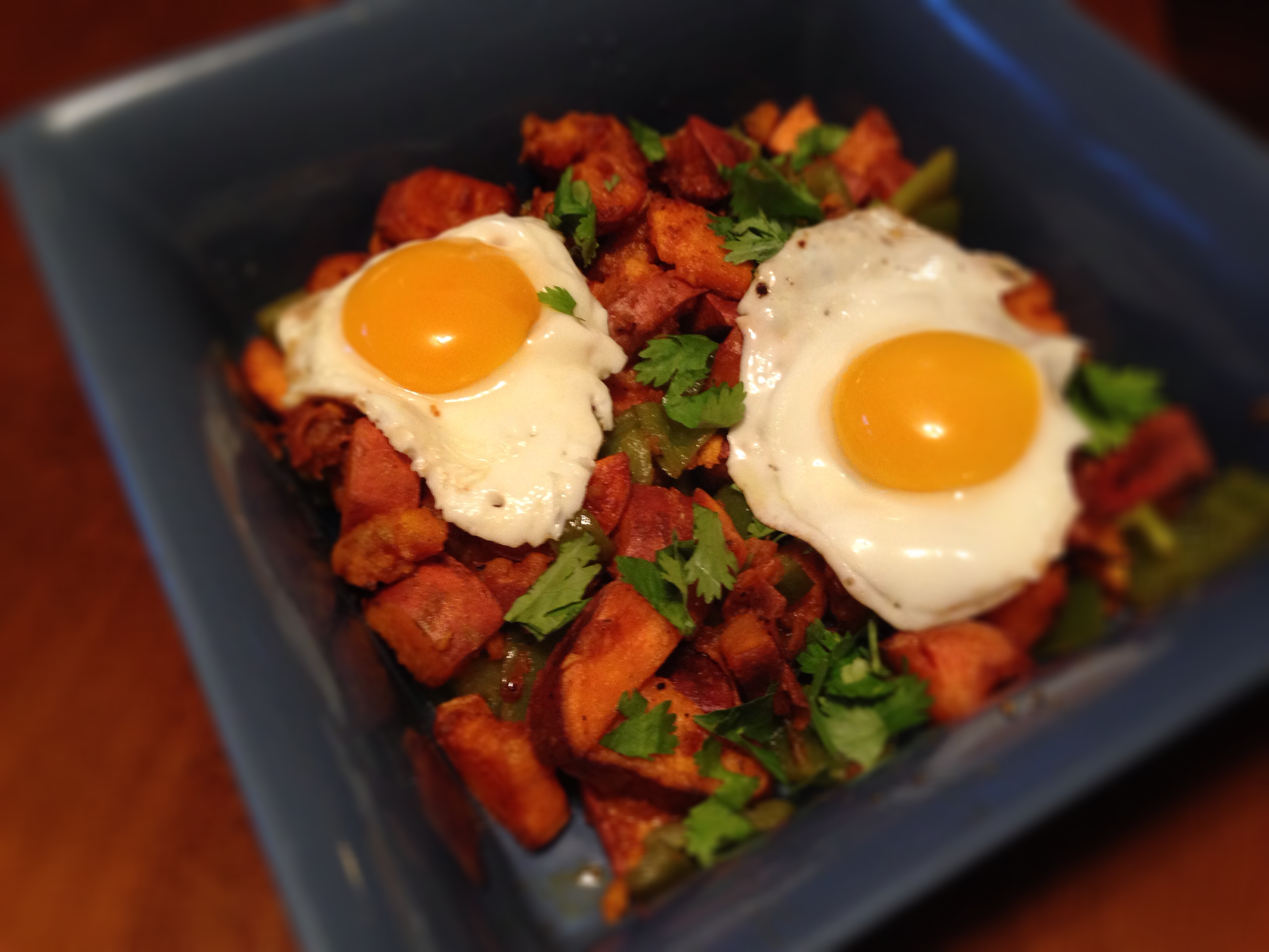- Fry eggs in separate skillet. (I actually used the same skillet that I sautéed the green peppers and garlic in!)