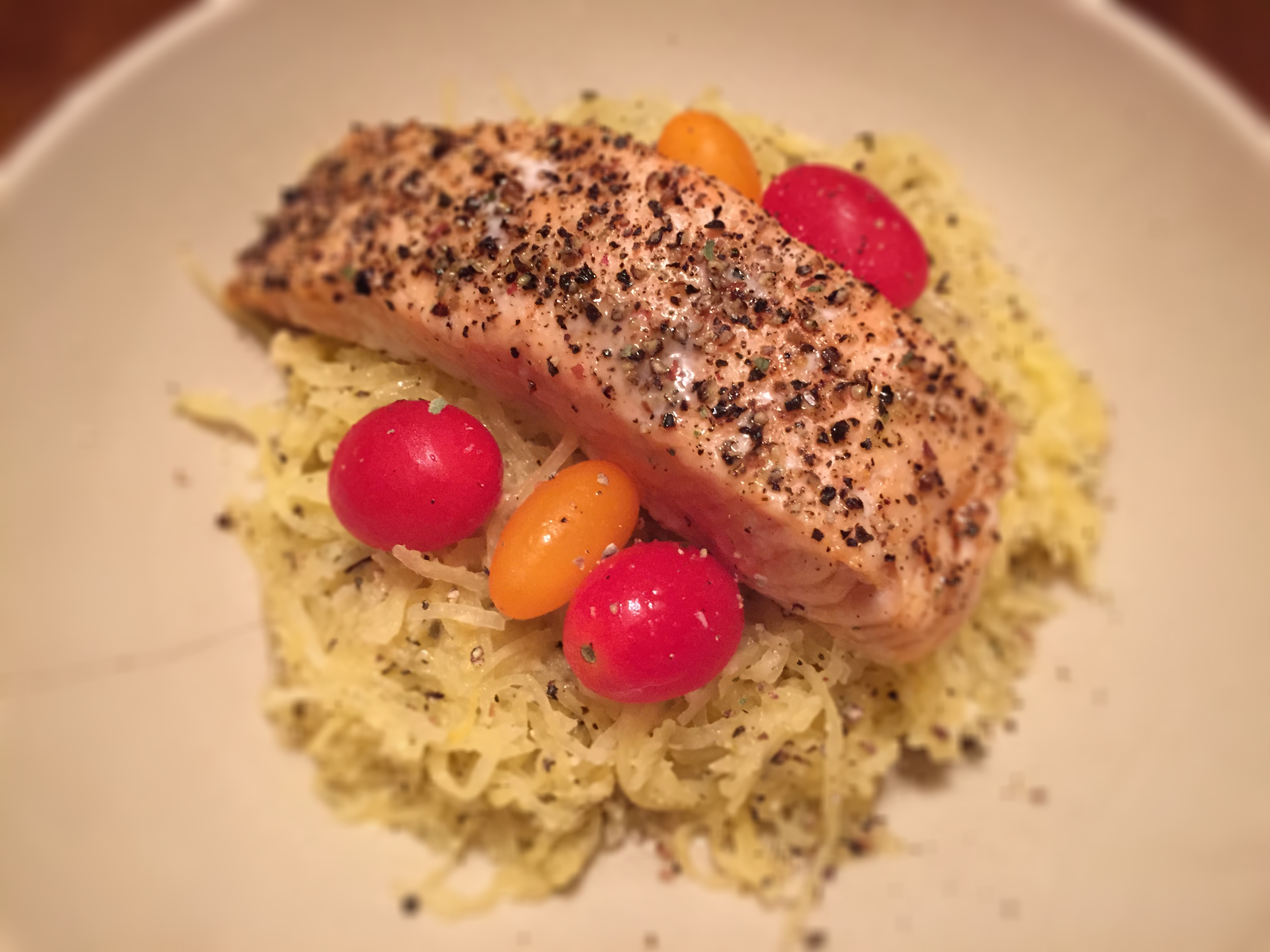 -Remove squash and salmon at the same time. Prepare spaghetti squash and let salmon rest for several minutes, top with cherry tomatoes, then serve and enjoy!