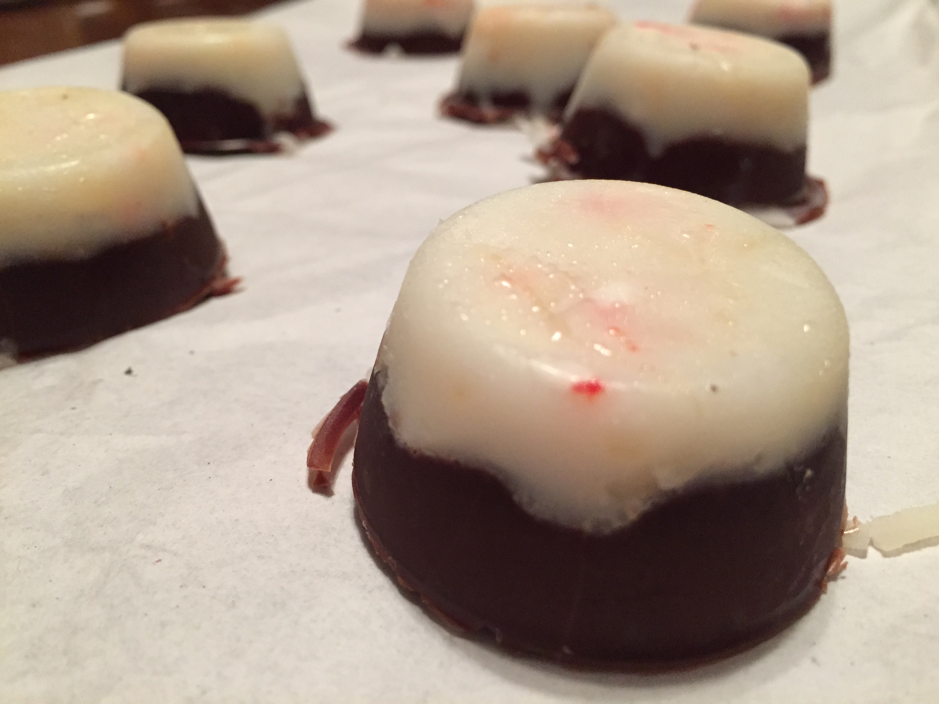 These little nuggets are so good, rich, and they taste like the holidays!!!! Nowwwww, you CAN make these purely paleo, but I went a little different with them, and quite liked them. They are pretty rich, and the crush candy canes I added in add a great little crunch and sweet to the patty. The one thing I would do is use real chocolate for the bottom. The original recipe calls for cocoa powder and coconut oil as the chocolate portion, but I would go for the real deal to make it a bit sweeter! (You guys know I’m a fan of chocolate chips!!!) I’ll give you both recipes – my sweeter, crunchier, chocolatey-er version, and the original if you want to make it paleo! These make great little bite sized gifts – throw them in a little holiday ziplock bag from Michael’s and boom – you’ve got a perfect little holiday treat!
