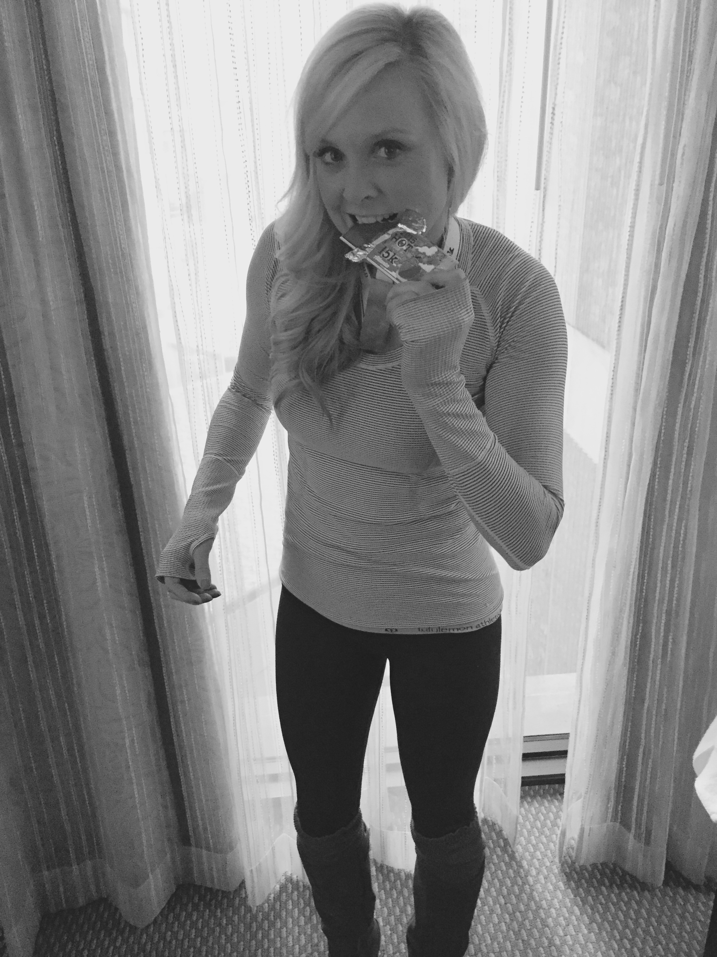 I have to admit right off the bat – the reason, and I’m saying the sole, one and only reason why I wanted to do this race was because of the finisher’s medal. The smart people behind this race knew exactly how to suck me (and millions of other women and men, but probably mostly women) in. They sent out an email entitled “Have you seen the 15k finisher’s medal?” Well, of course I had to take a gander…so, I opened the email…and then, I saw IT. The medal looked like a beautifully wrapped chocolate bar peeled back at the corner with a bite taken out of it! A. CHOCOLATE. BAR!!!!! I had to have it. One look, and I knew I had to have this one to add to my collection! I mean, seriously – doesn’t it look like I’m eating a chocolate bar??!!!