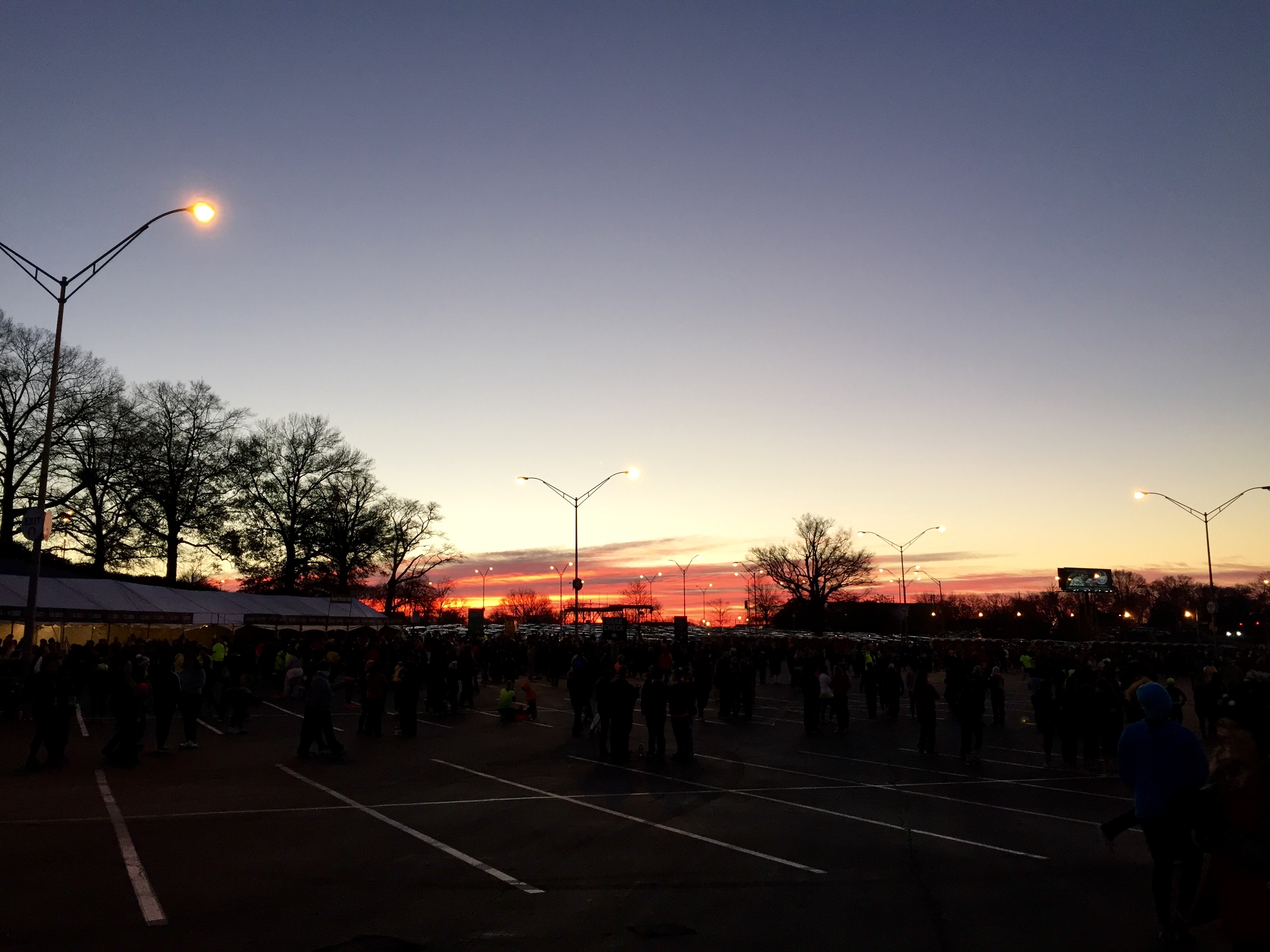The alarm went off at 5:20am, and I got up and put the coffee on. We got up, headed to the shuttle and froze for about 45 minutes before the run. We happened to find the merchandise tent where a bunch of people were huddled to keep warm – BODY WARMTH!!! 10 minutes before the start – we headed out, stopped and did a little zumba and got in our corral. One of the beauties about doing early am races is that sometimes you get to see the sunrise…
