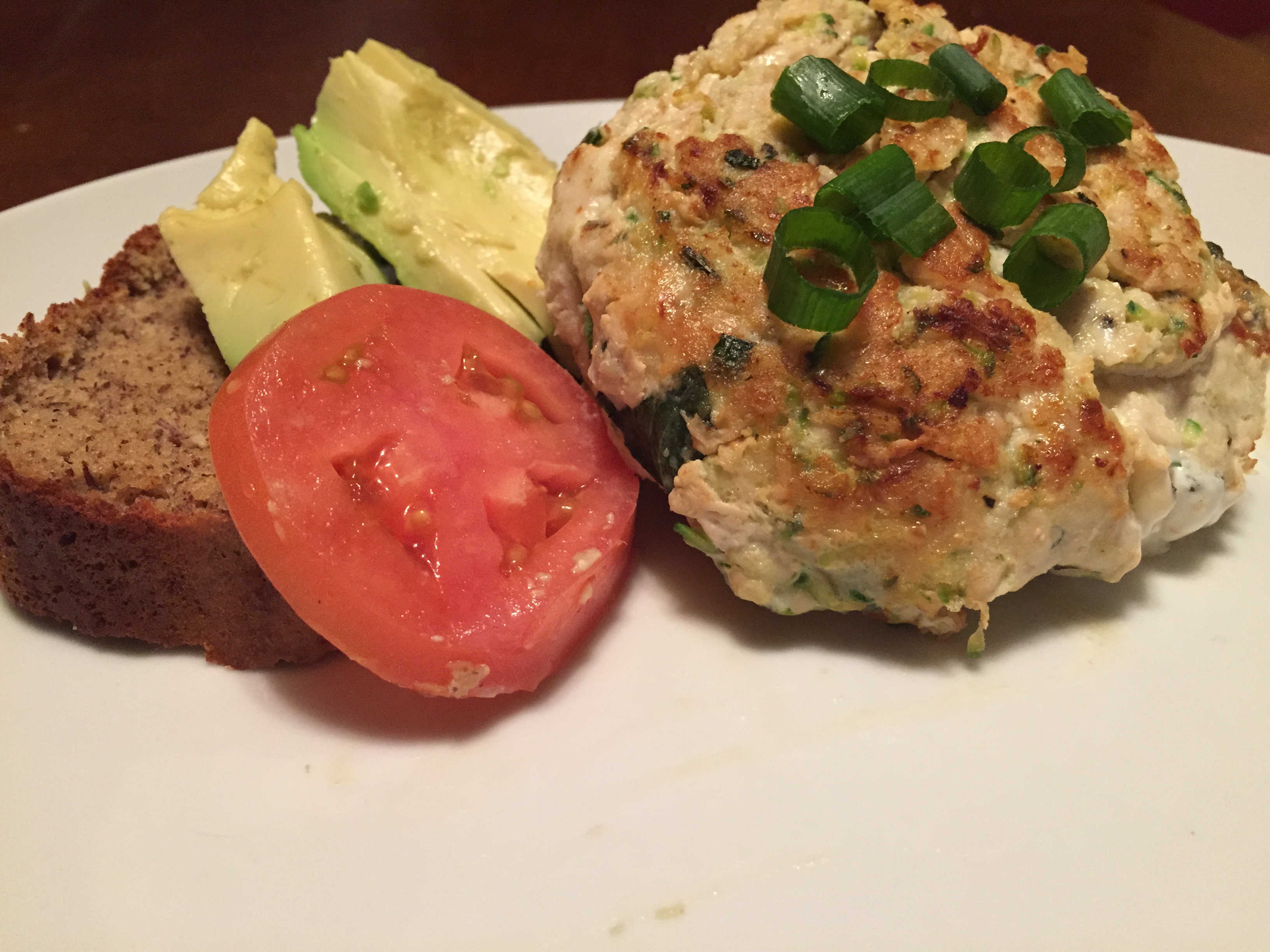 I originally made the paleo bread – the last recipe I posted – thinking I could serve the burgers on it. That was a no go, but let me tell you – this burger needs NO bread!!! I served it more as an open faced sandwich with the paleo bread, but you don’t even need the bread!! I found the burger recipe on The Iron You and adapted just a tad – adding in green onions instead of scallions, but you might want to try scallions or onions. I garnished with avocado and tomato and a little more green onions. So fresh, and SO good, and makes GREAT leftovers!!