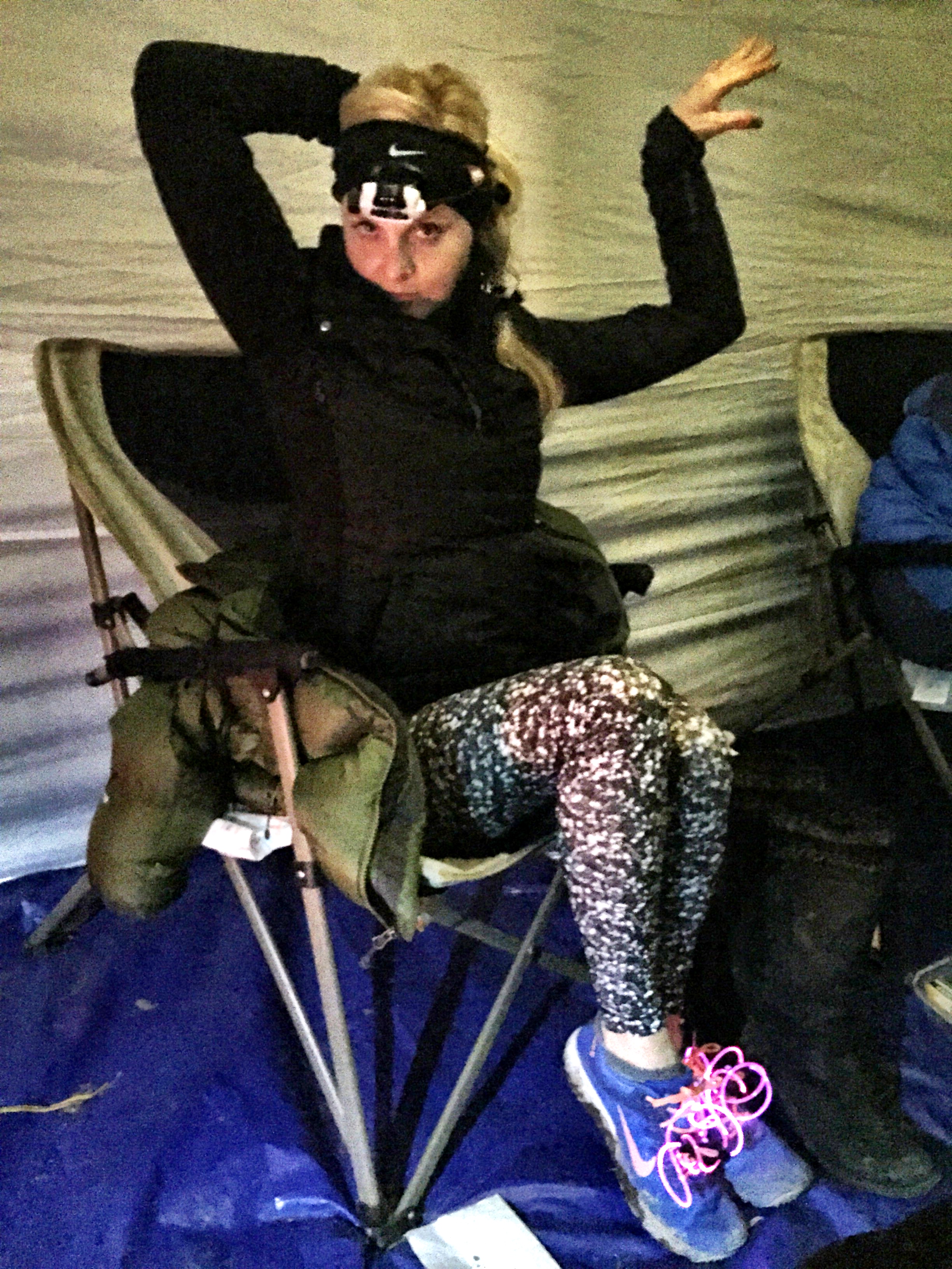 Half of the race is run during the day, and half at night. So, you’re literally out in the middle of the woods alone, wearing a headlamp in the pitch black night. You can bet that Criminal Minds, Blair Witch Project and the zombie apocalypse went through my mind a few times… Here I am getting geared up to run the last lap with my glow in the dark shoelaces (compliments of Katie as well).