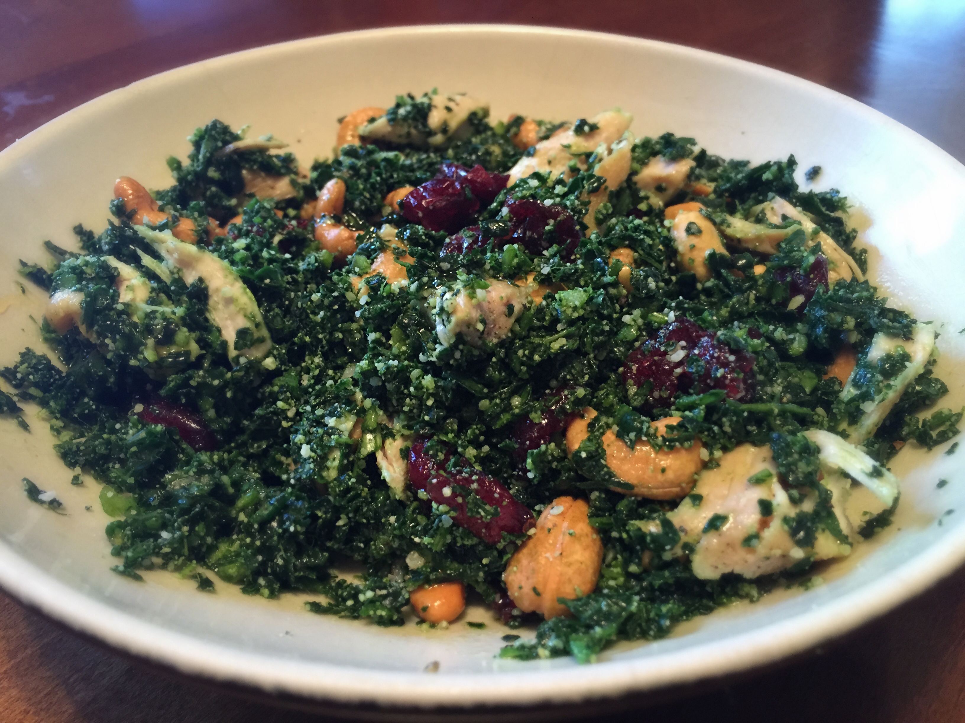 I came home from errands today and was craving a kale salad. Yes, I could have called Burger Up right down the street from me and paid $20 for their wonderful kale salad (I get it with salmon!), but I was like – hmmmm – I’m pretty sure I’ve got all I need at home. Well, except for cranberries. So, I stopped by the corner store, picked up some dried cranberries and voila! I had it all.