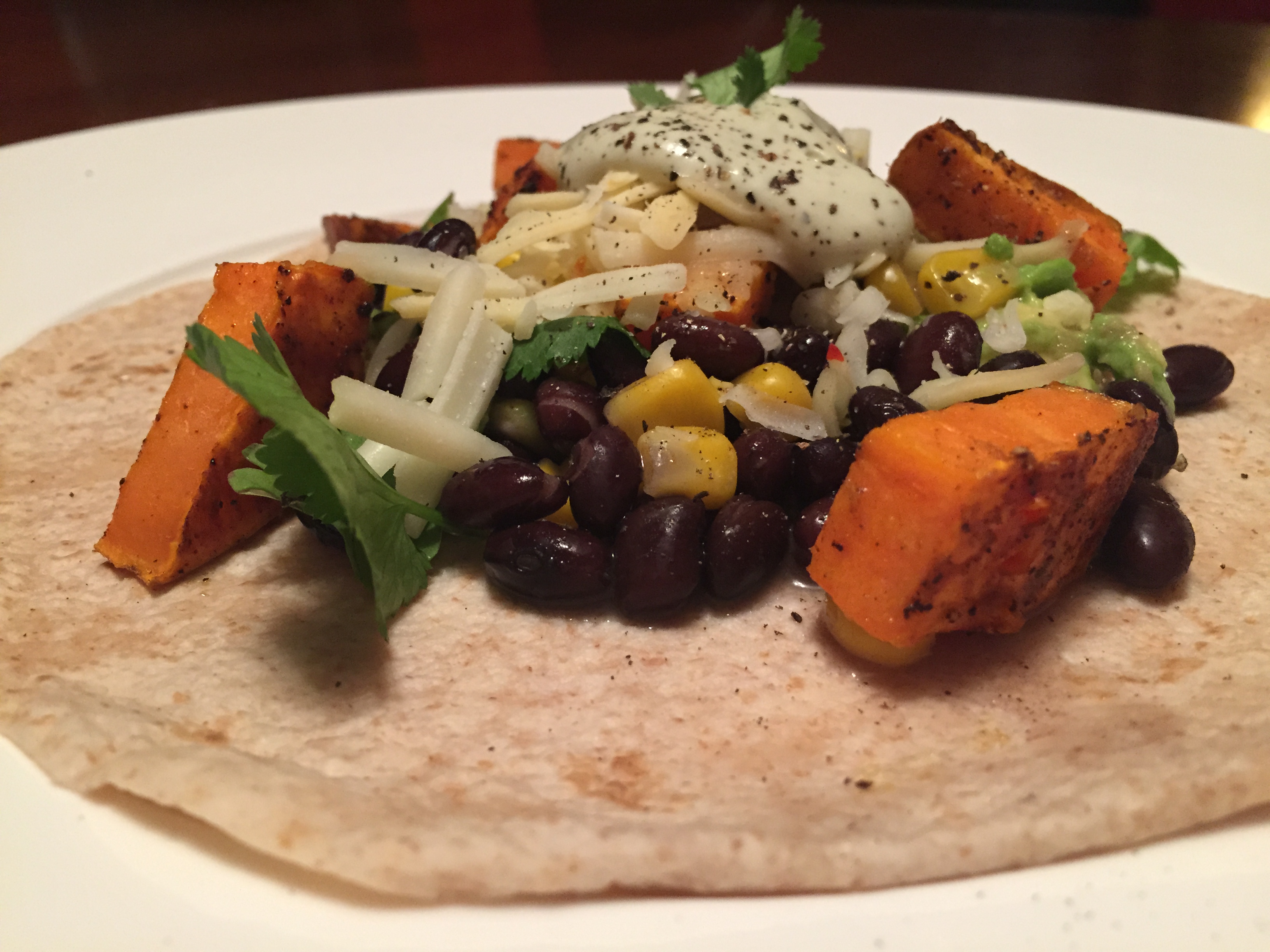- Assemble tacos with roasted sweet potatoes, diced avocado, black beans, scallions and cheese. Serve with avocado yogurt sauce.