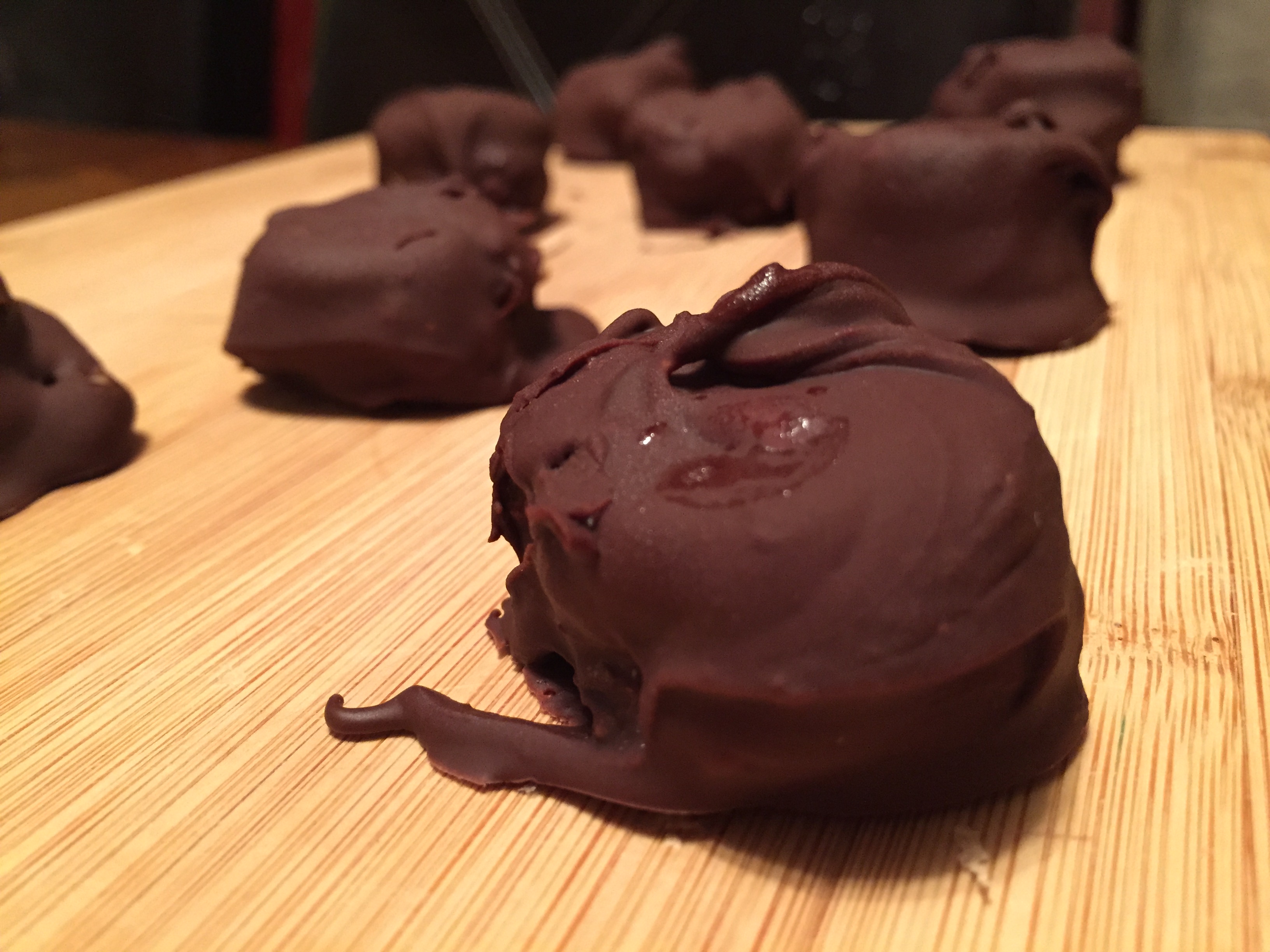 - Remove bites from the freezer and dip them into melted chocolate. You have to work quickly before the bites start to thaw and get mushy. If you want to take you time, you can work with one bite at a time and leave the others in the freezer. Using two forks, dip one bite in melted chocolate and roll it to cover all sides. Using one fork, remove bite from chocolate. With the other fork, remove excess chocolate and arrange the bite back on baking sheet. Move quickly because the chocolate might set in the bowl or the the bites might thaw! Time is not on your side with these puppies!