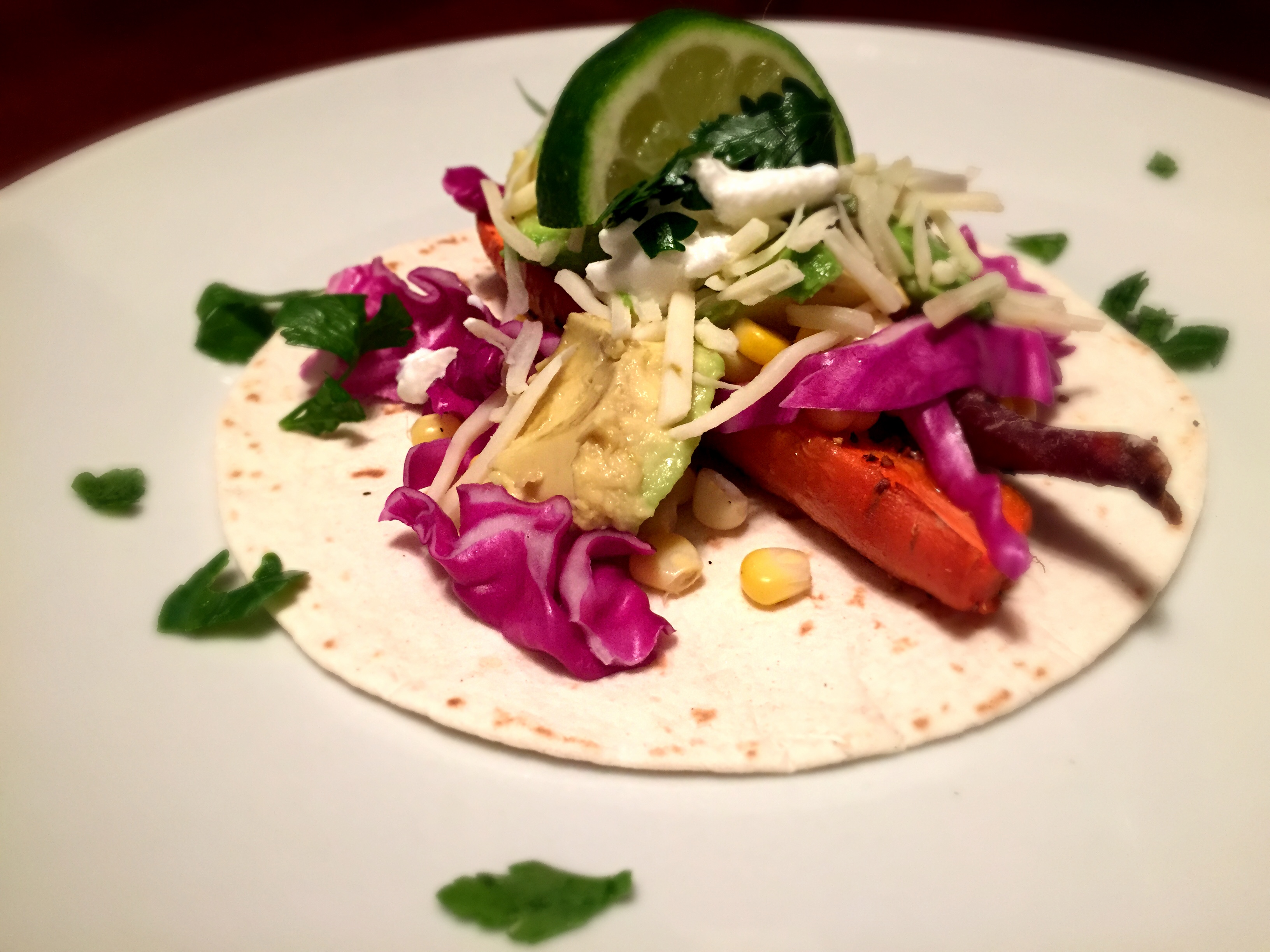 - When your veggies are finished in about 30 minutes, take them out and assemble your tacos. I placed the carrots on the bottom, then the corn, cabbage, pepper jack cheese, a dollop of Greek yogurt, cilantro, more pepper, and a slice of lime! Super fresh and easy!!