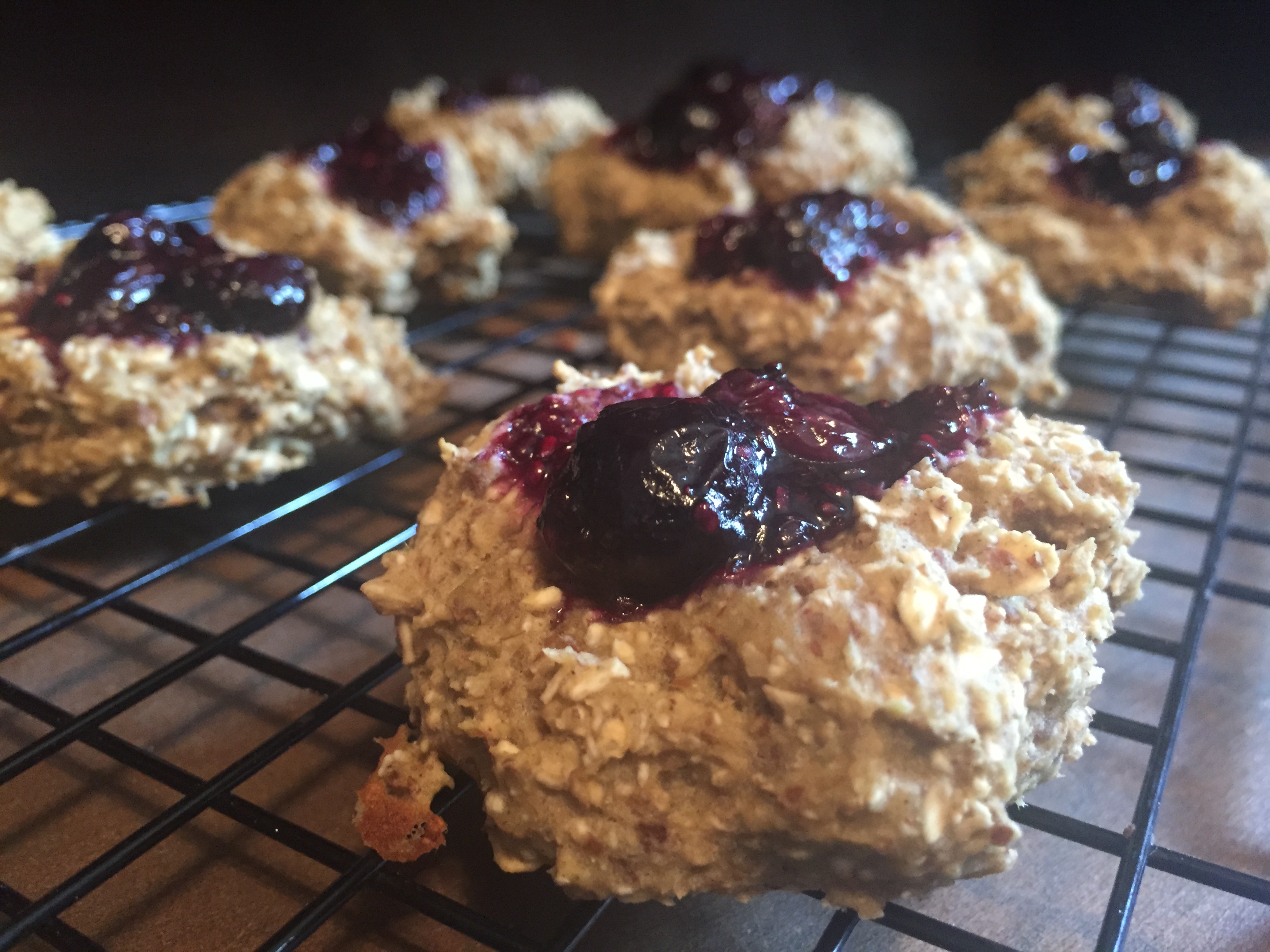 Aside from how easy it is to make you’re own jam, there is so much you can do with the jam once you’ve made it. It’s such a brilliant natural sweetener! I found the recipe for the thumbprint cookies on Oh She Glows – an ah-mazing vegan site! If you’re a lover of healthy food, check out her blog. I made a couple of adjustments to her recipe to add protein. Oh so good is what I call this one!
