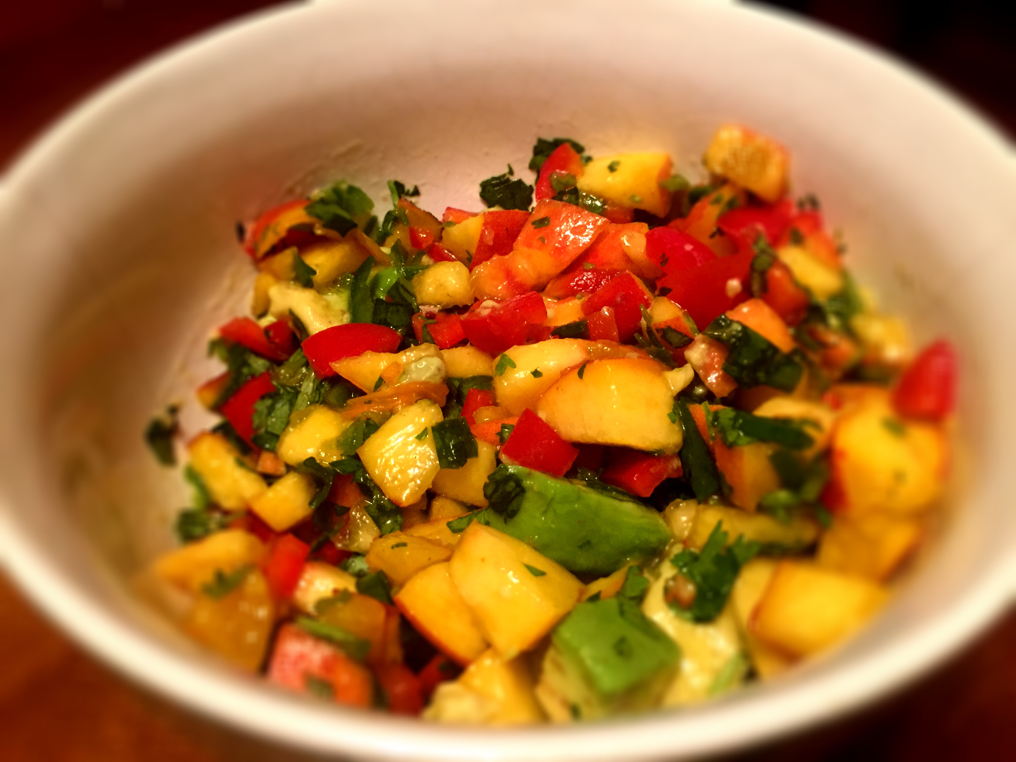I found the original recipe on Pioneer Woman and made just a few adjustments. Raw onions don’t do me well, so I replaced that with green onions, and since I used fresh peaches – I added a dash of maple syrup at the end to give it a little juice and sweetness.