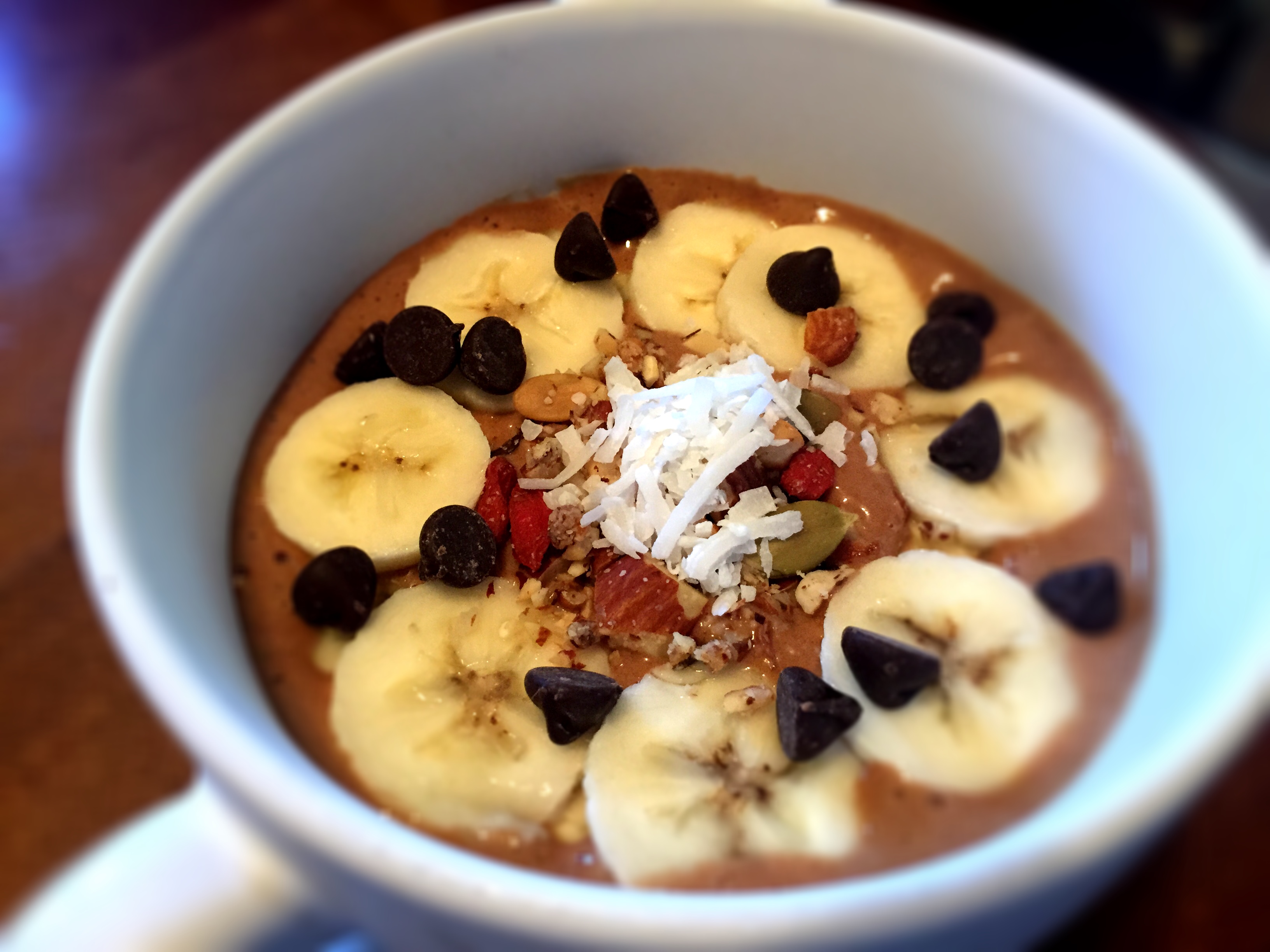 Combine all of the ingredients for the smoothie into a food processor or blender and blend until smooth. Pour into a bowl, and top your treat with more treats!!